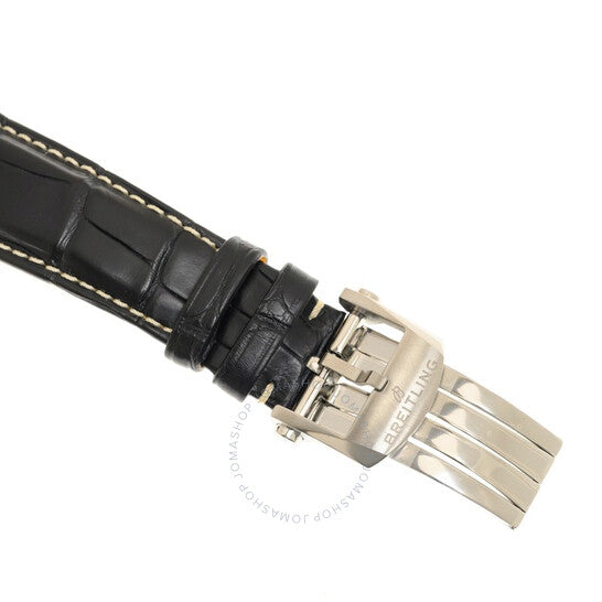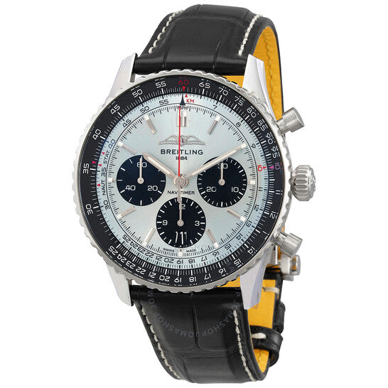 Silver-tone stainless steel case with a black alligator band. Bi-directional rotating silver-tone stainless steel bezel. Blue dial with silver-tone hands and index hour markers. Minute markers around the outer rim. Dial Type: Analog. Luminescent hands and markers. Date display at the 6 o'clock position. Chronograph - three sub-dials displaying: 60 second, 30 minute and 12 hour. Breitling Calibre 01 Automatic movement, containing 47 Jewels, composed of 346 parts, bitting at 28800 vph, and has a power reserve of approximately 70 hours. Scratch resistant sapphire crystal. Pull / push crown. Transparent see through case back. Round case shape, case size: 43 mm. Fold over clasp with a safety release. Water resistant at 30 meters / 100 feet. Functions: chronograph, column wheel, date, hour, minute, second, chronometer. Additional Info: original box, international warranty card, manual (complete accessories). Navitimer Series. Luxury watch style. Watch label: Swiss Made. Breitling Navitimer Chronograph Automatic Chronometer Blue Dial Men's Watch AB0138241C1P1.