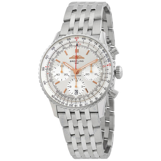 Silver-tone stainless steel case and bracelet. Bi-directional rotating silver-tone stainless steel bezel. Silver-tone dial with rose gold-tone hands and index hour markers. Minute markers around the outer rim. Dial Type: Analog. Luminescent hands and markers. Date display at the 6 o'clock position. Chronograph - three sub-dials displaying: 60 second, 30 minute and 12 hour. Breitling Calibre 01 Automatic movement, containing 47 Jewels, composed of 346 parts, bitting at 28800 vph, and has a power reserve of approximately 70 hours. Scratch resistant sapphire crystal. Pull / push crown. Transparent see through case back. Round case shape, case size: 41 mm. Deployment with push button release clasp. Water resistant at 30 meters / 100 feet. Functions: chronograph, column wheel, date, hour, minute, second, chronometer. Additional Info: original box, manual (complete accessories). Navitimer Series. Luxury watch style. Watch label: Swiss Made. Breitling Navitimer Chronograph Automatic Chronometer Silver Dial Men's Watch AB0139211G1A1.