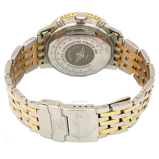 Stainless steel and 18kt yellow gold case with a navitimer two-tone band. Bi-directional rotating bezel. Black dial with gold-tone hands and Arabic numeral hour markers. Dial Type: Analog. Luminescent hands and markers. Date display between 4 and 5 o'clock position. Chronograph - three sub-dials displaying: 60 second, 30 minute and 12 hours. Automatic movement with a 42-hour power reserve. Scratch resistant sapphire crystal. Pull / push crown. Round case shape, case size: 41.5 mm. Deployment clasp. Water resistant at 30 meters / 100 feet. Functions: chronograph, date, hour, minute, second. Luxury watch style. Watch label: Swiss Made. Breitling Chronograph Automatic Black Dial Men's Watch D2232212/B567.423D.