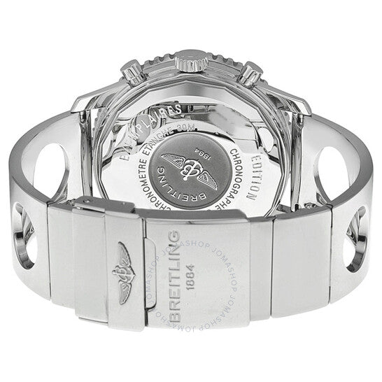 Stainless steel case with a stainless steel air racer bracelet. Bi-directional rotating stainless steel bezel. Black dial with silver-tone hands and 24 hour Arabic numeral hour markers. Minute markers. air speed markings. Dial Type: Analog. Luminescent hands and markers. Date display between 4 and 5 o'clock positions. Chronograph - three sub-dials displaying: 60 second, 30 minute and 12 hours. Breitling Calibre 22 automatic movement with about 42 hours of power reserve. Scratch resistant sapphire crystal. Solid case back. Case size: 43 mm. Case thickness: 14.4 mm. Round case shape. Band width: 22-20 mm. Deployment with push button release clasp. Water resistant at 30 meters / 100 feet. Functions: chronograph, airspeed date, hour, minute, second. Additional Info: 1,962-piece limited series. Luxury watch style. Watch label: Swiss Made. Breitling Navitimer Cosmonaute Chronograph Men's Watch A22322M6-B992SS.