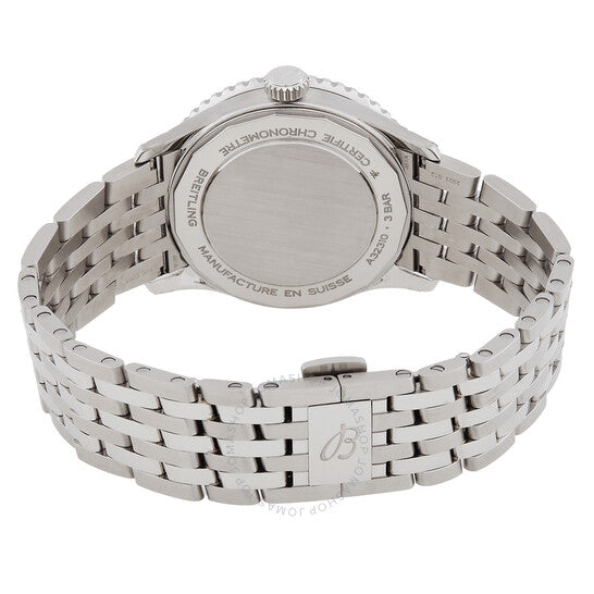 Silver-tone stainless steel case and bracelet. Silver-tone stainless steel bezel. Black dial with silver-tone hands and index hour markers. Minute markers around the outer rim. Dial Type: Analog. Luminescent hands and markers. Date display at the 6 o'clock position. Breitling Calibre 32 Automatic movement, based upon ETA 2893-2, containing 21 Jewels, bitting at 28800 vph, and has a power reserve of approximately 42 hours. Scratch resistant sapphire crystal. Pull / push crown. Round case shape, case size: 41 mm. Fold over clasp with a safety release. Water resistant at 30 meters / 100 feet. Functions: date, GMT, second time zone, hour, minute, chronometer. Additional Info: original box, manual (complete accessories). Navitimer Series. Luxury watch style. Watch label: Swiss Made. Breitling Navitimer GMT Automatic Chronometer Black Dial Men's Watch A32310251B1A1.