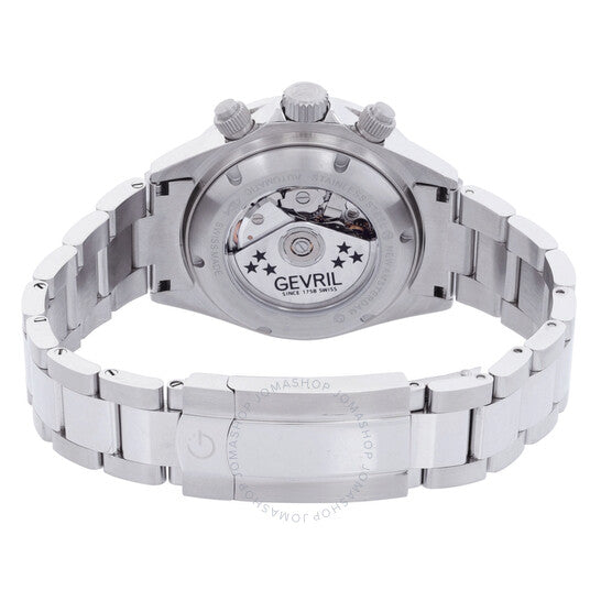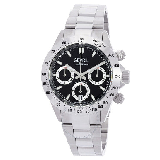 Silver-tone stainless steel case and bracelet. Fixed silver-tone stainless steel bezel. Black dial with silver-tone hands and index hour markers. Minute markers around the outer rim. Dial Type: Analog. Date display at the 6 o'clock position. Chronograph - three sub-dials displaying: 60 second, 30 minute and 12 hour. ETA-Valjoux Caliber 7753 Automatic movement, based upon ETA 7750, containing 27 Jewels, bitting at 28800 vph, and has a power reserve of approximately 44 hours. Scratch resistant sapphire crystal. Screw down crown. Transparent case back. Round case shape, case size: 40 mm, case thickness: 15.5 mm. Band width: 19 mm, band length: 8.5 inches. Deployment with push button release clasp. Water resistant at 200 meters / 660 feet. Functions: chronograph, date, hour, minute, second. Additional Info: chronograph, eta 7753 Swiss automatic movement. New Amsterdam Series. Luxury watch style. Watch label: Swiss Made. Gevril New Amsterdam Chronograph Automatic Black Dial Men's Watch 44607B.