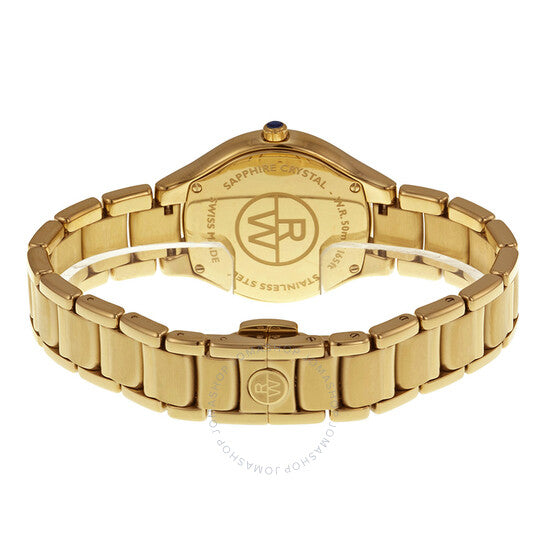 Yellow gold-plated stainless steel case and bracelet. Fixed yellow gold-plated bezel set with diamonds. White mother of pearl dial with gold-tone hands and diamond hour markers. Roman numerals mark the 6 and 12 o'clock positions. Minute markers around the inner ring. Dial Type: Analog. Quartz movement. Scratch resistant anti-reflective sapphire crystal. Pull / push crown. Solid case back. Case diameter: 32 mm. Case thickness: 7.58 mm. Round case shape. Bracelet width: 16 mm. Deployment clasp. Water resistant at 50 meters / 165 feet. Functions: hour, minute. Luxury watch style. Watch label: Swiss Made. Raymond Weil Noemia Mother of Pearl Diamond Dial Ladies Watch 5132-PS-00985.