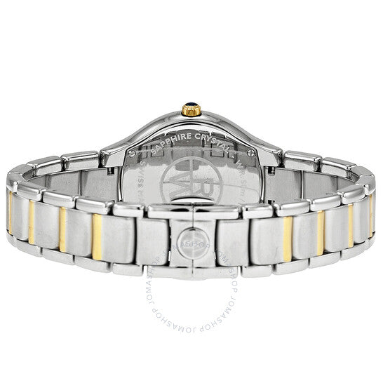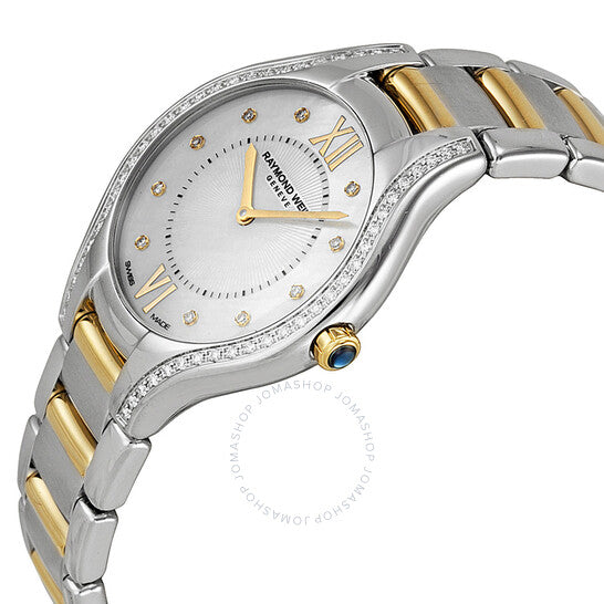 Stainless steel case with a two-tone (silver and yellow gold-tone) stainless steel bracelet. Fixed silver-tone bezel set with diamonds. Mother of pearl dial with yellow gold-tone hands and diamond hour markers. Roman numerals mark the 6 and 12 o'clock positions. Minute markers around an inner ring. Dial Type: Analog. Quartz movement. Scratch resistant sapphire crystal. Pull / push crown. Solid case back. Case diameter: 32 mm. Case thickness: 7.6 mm. Round case shape. Double push button fold over clasp. Water resistant at 50 meters / 165 feet. Functions: hour, minute. Dress watch style. Watch label: Swiss Made. Raymond Weil Noemia Mother Of Pearl Diamond Dial Two Tone Stainless Steel Ladies Watch 5132-SPS-00985.