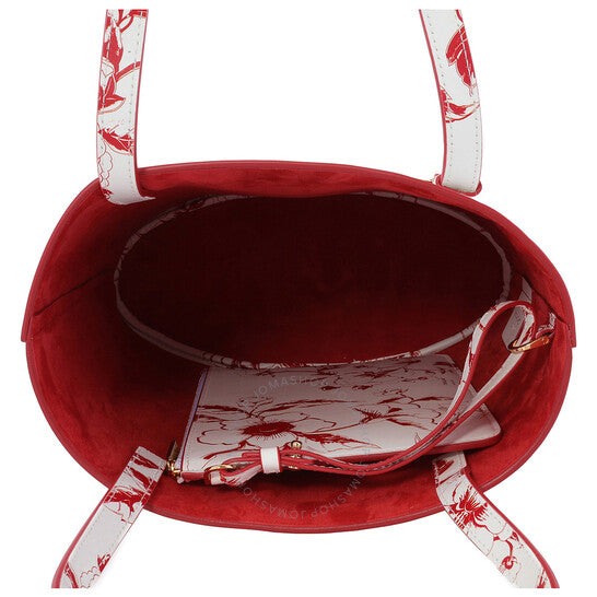 Ferragamo Ladies Tote. SKU: 218368 772177. Barcode: 8056283582513. Color: White. Ferragamo North-South Floral Print Tote Bag. The North-South tote features visible stitching, a reinforced base edge, a custom embossed logo on the front, a golden tag, floral print, dual top carry handles, and a tonal detachable pouch inside the main compartment.