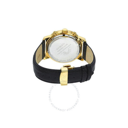 Porsamo Bleu NYC Chrono Men's Chronograph Watch With Mother of Pearl Black Dial; Genuine Leather Strap, Gold and Black Yellow gold-tone stainless steel case with a black leather strap. Fixed yellow gold-tone stainless steel bezel. Black dial with yellow gold-tone hands and index hour markers. Minute markers around the outer rim. Dial Type: Analog. Chronograph - three sub-dials displaying: 60 second, 30 minute and 24 hour. Miyota JS 20 Quartz quartz movement. Scratch resistant mineral crystal. Pull / push crown. Solid case back. Round case shape, case size: 47 mm, case thickness: 12 mm. Band width: 26 mm. Deployment with push button release clasp. Water resistant at 100 meters / 330 feet. Functions: chronograph, hour, minute, second. Nyc Chrono Series. Luxury watch style. Watch label: Japan Movt. Porsamo Bleu Nyc Chrono Chronograph Quartz Black Dial Men's Watch 1281BNYL.