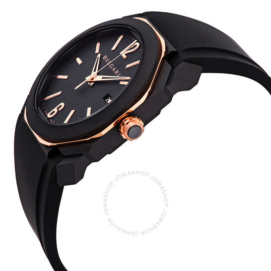 Black DLC sandblasted stainless steel case with a black rubber strap. Fixed black DLC sandblasted stainless steel with a 18kt rose gold bezel. Anthracite dial with rose gold-tone skeleton hands and index hour markers. Arabic numerals mark the 6 and 12 o'clock positions. Dial Type: Analog. Date display at the 3 o'clock position. Bvlgari Calibre BVL 191 Solotempo Automatic movement, containing 26 Jewels, bitting at 28800 vph, and has a power reserve of approximately 42 hours. Scratch resistant sapphire crystal. Pull / push crown. Transparent case back. Octagon case shape, case size: 41 mm. Tang clasp. Water resistant at 100 meters / 330 feet. Functions: date, hour, minute, second. Octo L'originale Series. Luxury watch style. Watch label: Swiss Made. Bvlgari Octo LOriginale Automatic Men's Watch 103085.