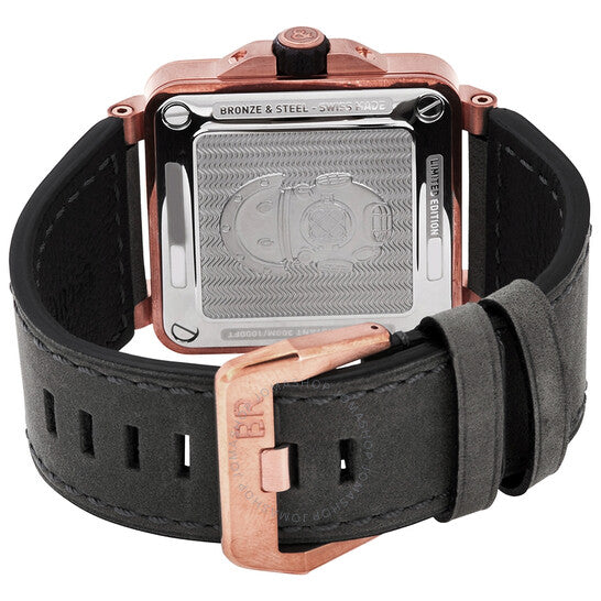 Satin-polished cusn8 bronze case with a grey-green calfskin leather and black rubber strap. Uni-directional rotating bezel. Olive green dial with rose gold-tone hands and dot hour markers. Minute markers around the outer rim. Dial Type: Analog. Luminescent hands and markers. Date display between 4 and 5 o'clock position. Bell and Ross Calibre BR-CAL.302 Automatic movement, based upon Sellita SW300-1, containing 25 Jewels, bitting at 28800 vph, and has a power reserve of approximately 38 hours. Scratch resistant sapphire crystal. Square case shape, case size: 42 mm x 42 mm. Water resistant at 300 meters / 1000 feet. Functions: date, hour, minute, second. Additional Info: limited edition of 999 pieces. Watch label: Swiss Made. Bell and Ross Olive Green Dial Automatic Men's Limited Edition Watch BR0392-D-G-BR/SCA.