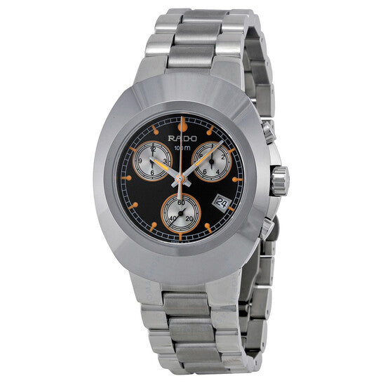 Stainless steel case with a stainless steel bracelet. Fixed stainless steel bezel. Black dial with luminous silver-tone hands and index hour markers. Minute markers around the outer rim. Dial Type: Analog. Luminescent hands and markers. Date display at the 4 o'clock position. Three sub-dials displaying: 12 hours, 1/10th seconds and 60 seconds. ETA caliber 256.262 quartz movement. Scratch resistant sapphire crystal. Pull / push crown. Solid case back. Round case shape. Case dimensions: 46 mm x 39 mm. Case thickness: 13 mm. Band width: 18 mm. Hidden fold over clasp. Water resistant at 100 meters / 330 feet. Functions: hour, minute, second. Additional Info: suitable for snorkeling, as well as swimming, but not diving. Casual watch style. Watch label: Swiss Made. Item Variations: R12638153, Rado-R12638153, 12638153. Rado Original Diastar Chronograph Black Dial Men's Watch R12638153.