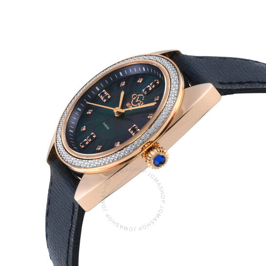 Rose gold-tone stainless steel case with a blue leather strap. Fixed rose gold-tone stainless steel bezel. Mother of pearl dial with rose gold-tone hands and diamond hour markers. Minute markers around the outer rim. Dial Type: Analog. Quartz movement. Scratch resistant sapphire crystal. Pull / push crown. Solid case back. Round case shape, case size: 35 mm, case thickness: 8.5 mm. Band width: 17 mm. Buckle clasp. Water resistant at 50 meters / 165 feet. Functions: hour, minute, second. Additional Info: 8 diamonds and 8 gemstones. Palermo Series. Fashion watch style. GV2 by Gevril Palermo Diamond Mother of Pearl Dial Ladies Watch 13104.