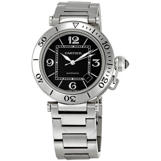 Stainless steel case with a stainless steel bracelet. Unidirectional rotating stainless steel bezel. Black dial with luminous diamond-shaped hands and index hour markers. Arabic numerals mark the 3, 6, 9, and 12 o'clock position. Minute markers around an inner ring. Dial Type: Analog. Luminescent hands. Date display between the 4 and 5 o'clocks. Automatic winding movement with a 42-hour power reserve. Scratch resistant sapphire crystal. Fluted screw down crown with a "Clou de Paris" set with black ceramic cabochon. Hours, Minutes, Seconds, Calendar. Luxury watch style. Watch label: Swiss Made. Item Variations: W31077M7, Cartier-W31077M7. Cartier Pasha Seatimer Automatic Black Dial Steel Men's Watch W31077M7.