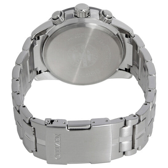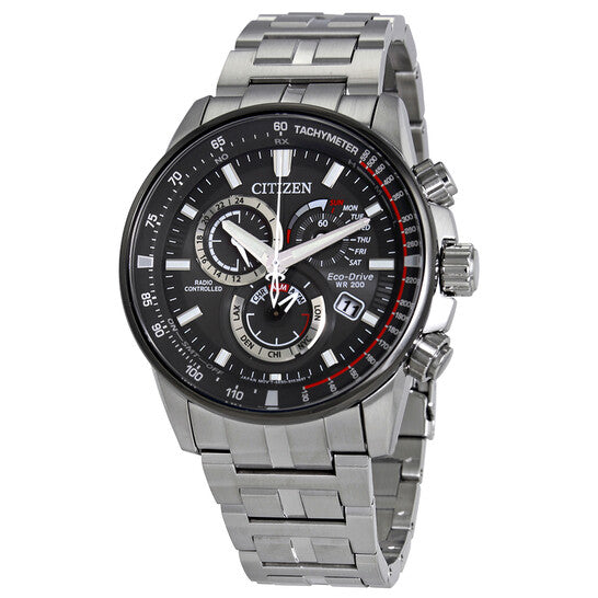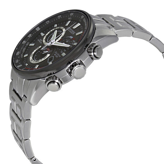 Stainless steel case with a stainless steel bracelet. Fixed dark grey stainless steel bezel. Tachymeter markings around the inner bezel. Dark grey dial with luminous silver-tone hands and index hour markers. Minute markers around the outer rim. Dial Type: Analog. Luminescent hands and markers. Perpetual calendar, Date display at the 4 o'clock position. Day of the week display. Chronograph - three sub-dials displaying: 60 second, 24 hours and alarm. Citizen caliber Eco-Drive E650 eco-drive movement. Scratch resistant sapphire crystal. Solid case back. Case size: 43 mm. Case thickness: 17 mm. Round case shape. Band width: 22 mm. Deployment clasp. Water resistant at 200 meters / 660 feet. Functions: chronograph, date, hour, minute, second, 5 time zones, power reserve indicator, alarm, atomic time. Additional Info: synchronized to atomic time clock for superior accuracy, atomic timekeeping technology with synchronized time. Sport watch style. Watch label: Japan Movt. Citizen PCAT Chronograph Perpetual Calendar Men's Watch AT4129-57H.