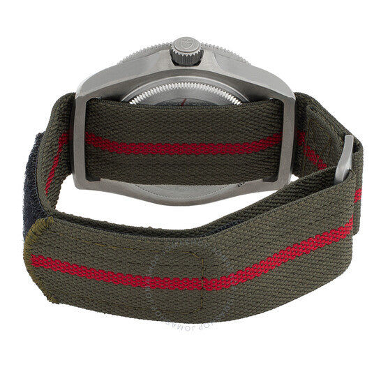 Silver-tone titanium case with a forest green/red fabric strap. Uni-directional rotating silver-tone titanium with ceramic disc bezel. Black matte dial with silver-tone hands and index hour markers. Minute markers around the outer rim. Dial Type: Analog. Luminescent hands and markers. Tudor Calibre MT5602 Automatic movement, based upon Tudor MT5612, containing 26 Jewels, bitting at 28800 vph, and has a power reserve of approximately 70 hours. Scratch resistant sapphire crystal. Screw down crown. Solid case back. Round case shape, case size: 42 mm, case thickness: 12.75 mm. Band width: 22 mm. Buckle clasp. Water resistant at 200 meters / 660 feet. Functions: hour, minute, second, chronometer. Pelagos Fxd Series. Luxury watch style. Watch label: Swiss Made. Tudor Pelagos FXD Automatic Chronometer Men's Watch M25717N-0001.