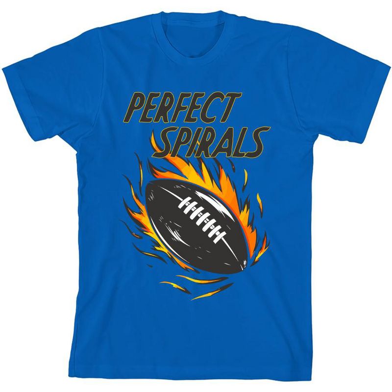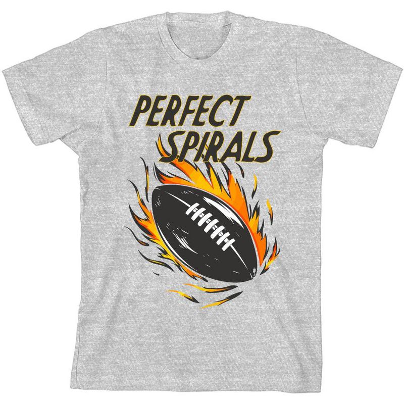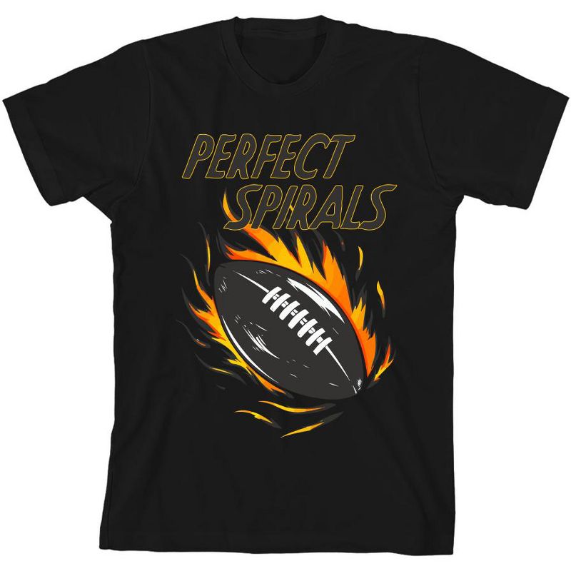 - CUSTOM DESIGNED: This football fan’s apparel features a big, colorful graphic of a flaming football and the words “Perfect Spirals”—an eye-catching image that has been professionally printed for long-lasting print quality.