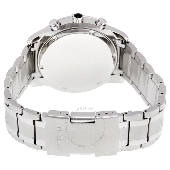 Stainless steel case with a stainless steel bracelet. Fixed stainless steel bezel. Blue dial with silver-tone hands and Arabic numeral hour markers. Minute markers around the outer rim. Dial Type: Analog. Luminescent hands and markers. Date display appears at the 4 o'clock position. Three sub-dials displaying: 24 hour, multi-function and 1/10th of a second. Eco-drive movement. Scratch resistant mineral crystal. Black cabochon crown. Solid case back. Case diameter: 44 mm. Case thickness: 13 mm. Round case shape. Band width: 22 mm. Tang clasp. Water resistant at 100 meters / 330 feet. Functions: chronograph, date, hour, minute, second. Dress watch style. Watch label: Japan Movt. Item Variations: BL5470 57L, BL5470.57L, BL547057L. Citizen Perpetual Calendar Eco-Drive Chronograph Blue Dial Men's Watch BL5470-57L.