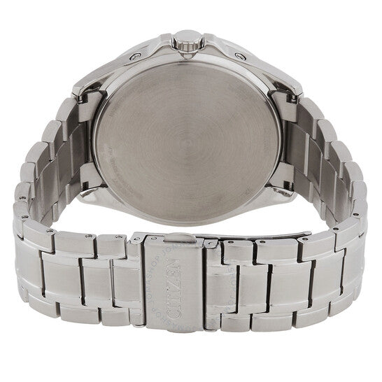 Silver-tone stainless steel case and bracelet. Fixed silver-tone stainless steel bezel. Blue dial with silver-tone hands and index hour markers. Dial Type: Analog. Luminescent hands and markers. Perpetual calendar. Date, signal reception indicator, summer time indicator subdials. Citizen Caliber Eco-Drive H145 eco-drive movement. Scratch resistant sapphire crystal. Round case shape, case size: 43 mm. Water resistant at 100 meters / 330 feet. Functions: perpetual calendar, atomic timekeeping, radio controlled, world time, date, GMT, second time zone, hour, minute, second, solar-powered. Watch label: Japan Movt. Citizen Perpetual World Time Blue Dial Men's Watch CB0250-84L.