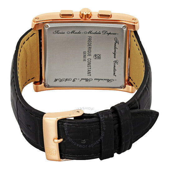 Rose gold PVD stainless steel case with a black leather strap. Fixed rose gold PVD bezel. Silver dial with black-tone hands and Roman numearl hour markers. Minute markers around the inner ring. Dial Type: Analog. Date display at the 4 o'clock position. Chronograph - three sub-dials displaying: 60 second, 30 minute and 12 hour. Quartz movement. Scratch resistant sapphire crystal. Pull / push crown. Solid case back. Case size: 46 mm. Case thickness: 10 mm. Rectangle case shape. Tang clasp. Water resistant at 30 meters / 100 feet. Functions: chronograph, date, hour, minute, second. Sport watch style. Watch label: Swiss Made. Frederique Constant Persuasion Chroograph Silver Dial Men's Watch FC-292MS4C24.