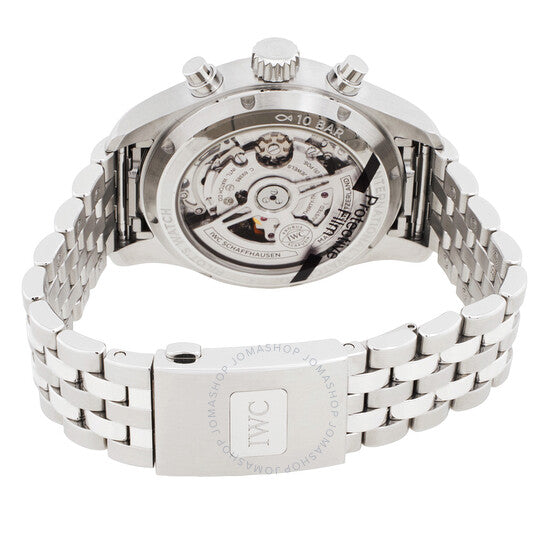 Stainless steel case with a stainless steel bracelet. Fixed stainless steel bezel. Blue dial with luminous black hands and Arabic numeral hour markers. Minute markers around the outer rim. Luminescent hands and markers. Day of the week and date display at the 3 o'clock position. Chronograph - three sub-dials displaying: 60 second, 30 minute and 1/10th of a second. IWC calibre 69385 automatic movement, containing 33 Jewels, composed of 231 parts, bitting at 28800 vph, and has a power reserve of approximately 46 hours. Scratch resistant sapphire crystal. Screw down crown. Transparent case back. Round case shape. Case size: 41 mm. Case thickness: 14.5 mm. Band width: 20 mm. Tang clasp. Water resistant at 100 meters / 330 feet. Functions: chronograph, hour, minute, second. Pilot Series. Sport watch style. Watch label: Swiss Made. IWC Pilot Chronograph 41 Automatic Blue Dial Men's Watch IW388102.