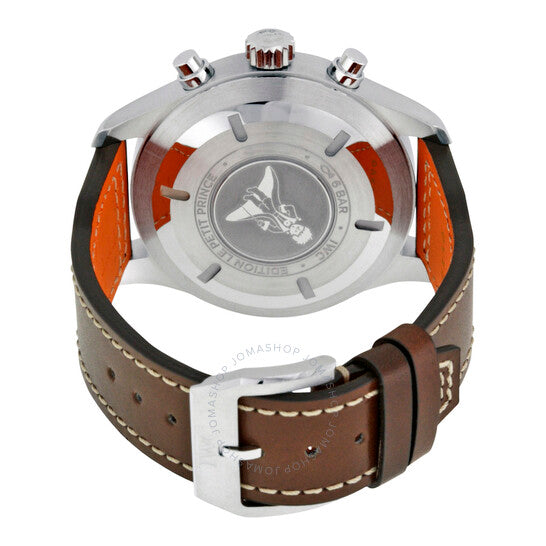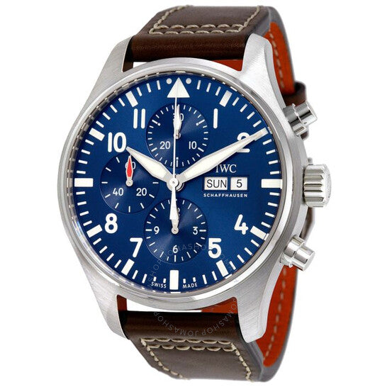 Stainless steel case with a brown (calfskin) leather strap. Fixed stainless steel bezel. Midnight blue dial with luminous silver-tone hands and Arabic numeral hour markers. Minute markers around the outer rim. Dial Type: Analog. Luminescent hands and markers. Day of the week and date display at the 3 o'clock position. Chronograph - three sub-dials displaying: 60 seconds, 30 minute, and 12 hours. IWC calibre 79320 automatic movement, based upon ETA 7750, containing 31 Jewels, bitting at 28800 vph, and has a power reserve of approximately 44 hours. Scratch resistant sapphire crystal. Screw down crown. Solid case back. Round case shape. Case size: 43 mm. Case thickness: 15 mm. Tang clasp. Water resistant at 60 meters / 200 feet. Functions: chronograph, date, day, hour, minute, second. Pilot Le Petit Prince Series. Pilot watch style. Watch label: Swiss Made. IWC Pilot Midnight Automatic Chronograph Blue Dial Men's Watch IW377714.