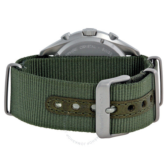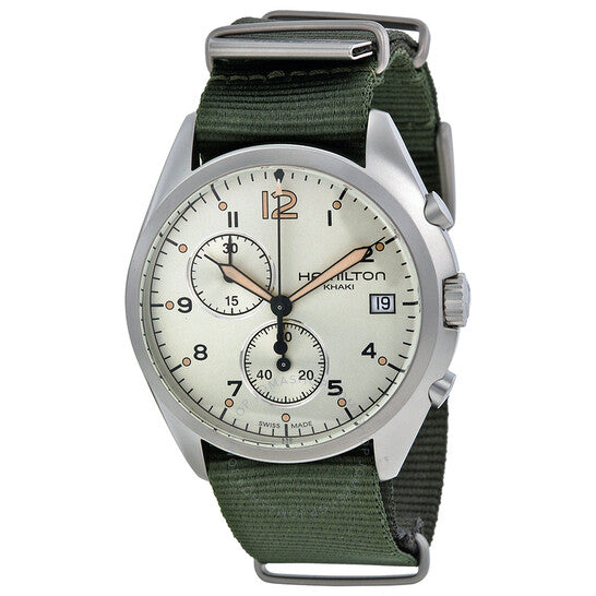 Stainless steel case with a khaki canvas strap . Fixed stainless steel bezel. Silver dial with luminous hands and Arabic numeral hour markers. Minute markers around the outer rim. Dial Type: Analog. Luminescent hands and markers. Date display at the 3 o'clock position. Chronograph - two sub-dials displaying: 60 second and 30 minute. Quartz movement. Scratch resistant sapphire crystal. Solid case back. Case diameter: 41 mm. Case thickness: 13 mm. Round case shape. Band width: 22 mm. Tang clasp. Water resistant at 100 meters / 330 feet. Functions: chronograph, date, hour, minute, second. Casual watch style. Hamilton Pilot Pioneer Chronograph Men's Watch H76552955.
