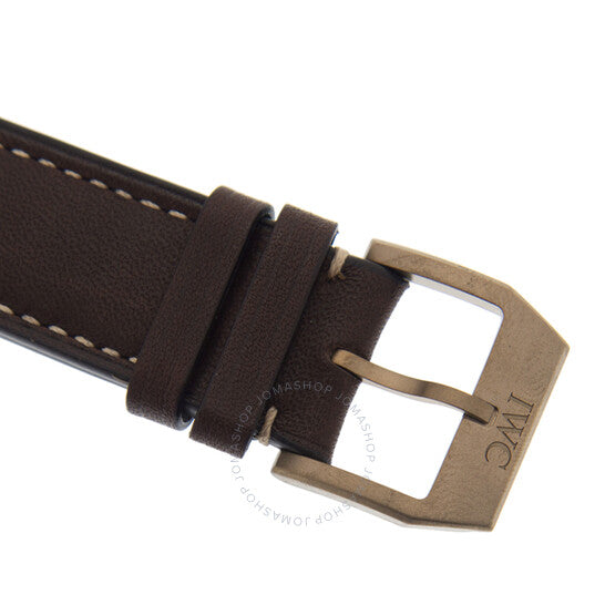 Bronze case with a brown (calfskin) leather strap. Fixed bronze bezel. Green dial with luminous bronze-tone hands and Arabic numeral hour markers. Minute markers around the outer rim. Dial Type: Analog. Luminescent hands and markers. Date display at the 3 o'clock position. IWC calibre 32110 automatic movement, based upon ETA 2892-A2, containing 21 Jewels, bitting at 28800 vph, and has a power reserve of approximately 72 hours. Scratch resistant sapphire crystal. Screw down crown. Solid case back. Round case shape. Case size: 39 mm. Case thickness: 10.6 mm. Band width: 20 mm. Tang clasp. Water resistant at 60 meters / 200 feet. Functions: date, hour, minute, second. Additional Info: frequency 28800.0 vph (4.0 hz). 21 jewels. Pilot Spitfire Series. Pilot watch style. Watch label: Swiss Made. IWC Pilot Spitfire Automatic Green Dial Men's Watch IW326802.