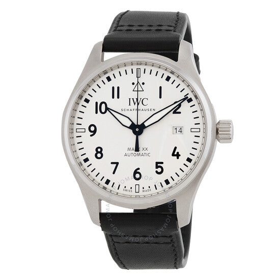 Silver-tone stainless steel case with a black leather strap. Fixed silver-tone stainless steel bezel. White dial with black hands and Arabic numeral hour markers. Minute markers around the outer rim. Dial Type: Analog. Luminescent hands and markers. Date display at the 3 o'clock position. IWC Calibre 32111 automatic movement with a 120-hour power reserve. Scratch resistant sapphire crystal. Screw down crown. Solid case back. Round case shape, case size: 40 mm, case thickness: 10.8 mm. Buckle clasp. Water resistant at 100 meters / 330 feet. Functions: date, hour, minute, second. Pilots Series. Luxury watch style. Watch label: Swiss Made. IWC Pilots Automatic White Dial Men's Watch IW328207.
