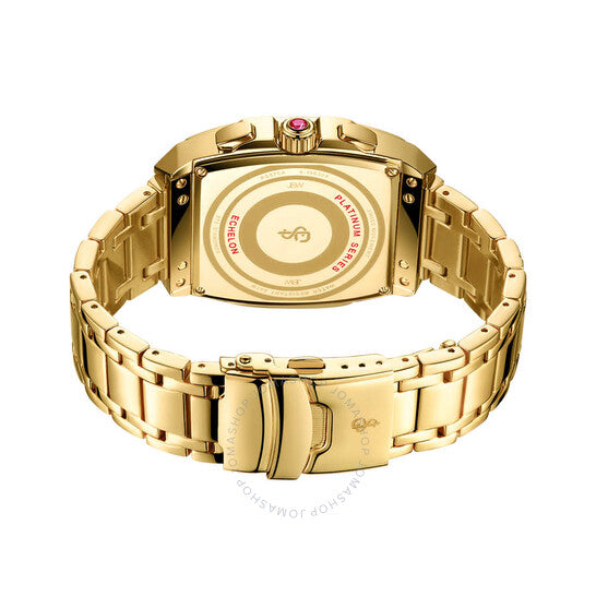 Echelon PS levels up a classic silhouette with 570 diamonds set on the case, bezel, dial center, and bracelet, totaling 2.85 carats. Unique details, including a ruby set on the crown and the individual production number engraved on the case, complete the look. This timepiece is crafted in durable, 18K gold-plated stainless steel with a Swiss chronograph movement. Included with an exclusive PS storage box and four year Platinum Warranty coverage.