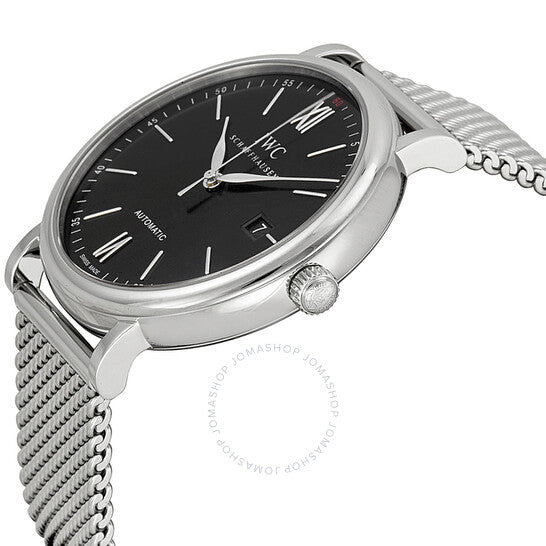 Stainless steel case with a stainless steel milanese bracelet. Fixed stainless steel bezel. Black dial with silver-tone hands and index hour markers. Roman numerals mark the 6 and 12 o'clock positions. Minute markers around the outer rim. Dial Type: Analog. Date display at the 3 o'clock position. Automatic movement with a 42-hour power reserve. Scratch resistant sapphire crystal. Pull / push crown. Solid case back. Case diameter: 40 mm. Case thickness: 9 mm. Round case shape. Bracelet width: 20 mm. Deployment clasp with a push button release. Water resistant at 30 meters / 100 feet. Functions: date, hour, minute, second. Luxury watch style. Watch label: Swiss Made. IWC Portofino Black Dial Stainless Steel Men's Watch IW356506.