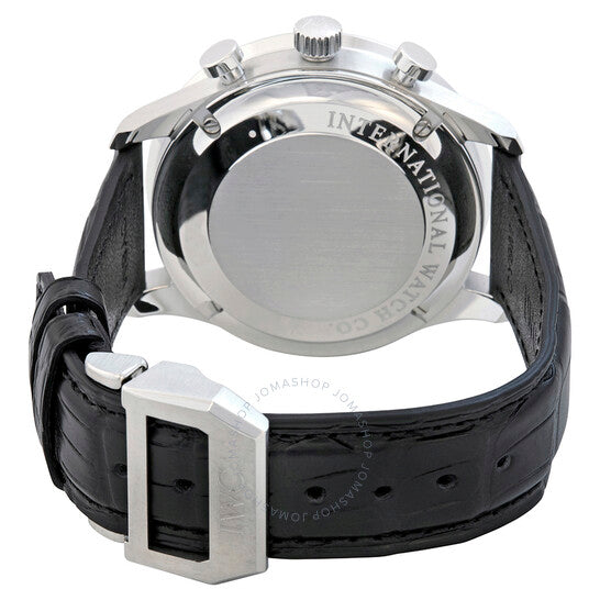 Silver-tone stainless steel case with a black alligator leather strap. Fixed silver-tone stainless steel bezel. Blue dial with silver-tone leaf-style shape hands and Arabic numeral hour markers. Minute markers around the outer rim. Dial Type: Analog. Chronograph - two sub-dials displaying: 60 second and 30 minute. IWC Calibre 79350 Automatic movement, based upon ETA 7750, containing 31 Jewels, bitting at 28800 vph, and has a power reserve of approximately 44 hours. Scratch resistant sapphire crystal. Pull / push crown. Solid case back. Round case shape, case size: 40.9 mm, case thickness: 12.6 mm. Deployment clasp. Water resistant at 30 meters / 100 feet. Functions: chronograph, hour, minute, second. Portugieser Series. Luxury watch style. Watch label: Swiss Made. IWC Portugieser Automatic Chronograph Blue Dial Men's Watch IW371491.