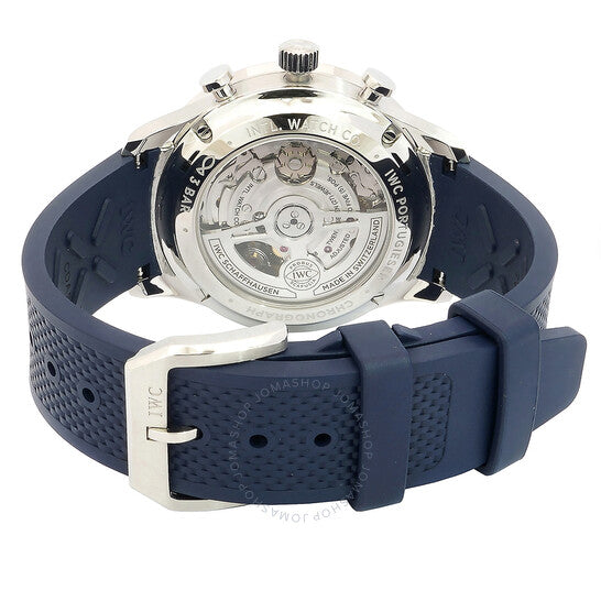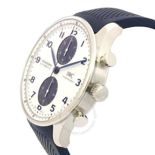 Stainless steel case with a blue rubber strap. Fixed bezel. White dial with Arabic numeral hour markers. Dial Type: Analog. Chronograph - two sub-dials displaying: 60 second and 30 minute. IWC Calibre 69355 Automatic movement, based upon IWC 69370, containing 27 Jewels, composed of 194 parts, bitting at 28800 vph, and has a power reserve of approximately 46 hours. Scratch resistant sapphire crystal. Transparent see through case back. Round case shape, case size: 41 mm, case thickness: 13 mm. Deployment clasp. Water resistant at 30 meters / 100 feet. Functions: chronograph, column wheel, hour, minute, small second. Portugieser Series. Luxury watch style. Watch label: Swiss Made. IWC Portugieser Chronograph Automatic White Dial Men's Watch IW371620.