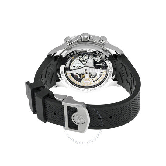 Silver-tone stainless steel case with a black rubber strap. Fixed silver-tone stainless steel bezel. White dial with luminous silver-tone leaf-style shape hands and Arabic numeral hour markers. Minute markers around the outer rim. Dial Type: Analog. Luminescent hands and markers. Date display at the 3 o'clock position. Chronograph - two sub-dials displaying: 60 second and a dual 60 minute / 2nd time zone. IWC Calibre 89361 Automatic movement, based upon IWC 89360, containing 38 Jewels, and has a power reserve of approximately 68 hours. Scratch resistant sapphire crystal. Screw down crown. Skeleton case back. Round case shape, case size: 43.5 mm, case thickness: 14.5 mm. Deployment clasp. Water resistant at 60 meters / 200 feet. Functions: chronograph, flyback, date, hour, minute, small second. Portugieser Yacht Club Series. Luxury watch style. Watch label: Swiss Made. IWC Portugieser Yacht Club Automatic Men's Watch 3905-02.