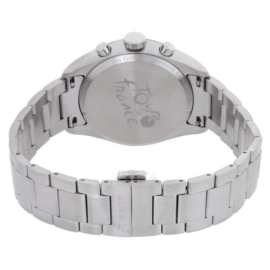 Silver-tone stainless steel case and bracelet. Fixed silver-tone stainless steel bezel. Black dial with silver-tone hands and index hour markers. Minute markers around the outer rim. Dial Type: Analog. Luminescent hands and markers. Date display between 4 and 5 o'clock position. Chronograph - three sub-dials displaying: 60 second, 30 minute and 1/10th of a second. ETA Caliber G10.212 AB quartz movement. Scratch resistant sapphire crystal. Solid case back. Round case shape, case size: 40 mm, case thickness: 11.3 mm. Band width: 20 mm. Water resistant at 100 meters / 330 feet. Functions: chronograph, rattrapante, date, hour, minute, small second. Pr 100 Series. Sport watch style. Watch label: Swiss Made. Tissot PR 100 Chronograph Quartz Black Dial Men's Watch T150.417.11.051.00.