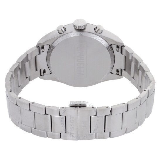 Silver-tone stainless steel case and bracelet. Fixed silver-tone stainless steel bezel. Black dial with silver-tone hands and index hour markers. Minute markers around the outer rim. Dial Type: Analog. Luminescent hands and markers. Date display between 4 and 5 o'clock position. Chronograph - three sub-dials displaying: 60 second, 30 minute and 1/10th of a second. Quartz movement. Scratch resistant sapphire crystal. Solid case back. Round case shape, case size: 40 mm, case thickness: 11.2 mm. Band width: 20 mm. Butterfly clasp. Water resistant at 100 meters / 330 feet. Functions: chronograph, rattrapante, date, hour, minute, small second. Pr 100 Series. Sport watch style. Watch label: Swiss Made. Tissot PR 100 Chronograph Quartz Black Dial Men's Watch T1504171105101.