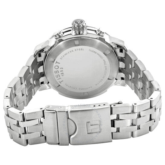 Stainless steel case with a stainless steel bracelet. Fixed stainless steel bezel. Blue dial with luminous silver-tone hands and index hour markers. Arabic numeral markers at the 3, 9 and 12 o'clock positions. Minute markers. Tachymeter markings around the outer rim. Dial Type: Analog. Luminescent hands and markers. Date display between the 4 and 5 o'clock positions. Chronograph - three sub-dials displaying: 60 second, 30 minute and 1/10th of a second. ETA caliber G10.212 quartz movement. Scratch resistant sapphire crystal. Screw down crown. Solid case back. Round case shape. Case size: 42 mm. Case thickness: 12 mm. Band width: 20 mm. Fold over clasp with a safety release. Water resistant at 200 meters / 660 feet. Functions: chronograph, rattrapante, date, hour, minute, small second. Prc 200 Series. Sport watch style. Watch label: Swiss Made. Tissot PRC 200 Chronograph Quartz Blue Dial Men's Watch T114.417.11.047.00.