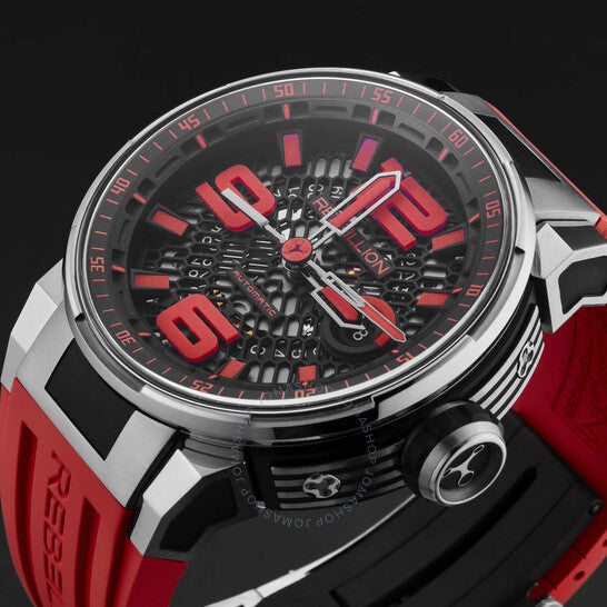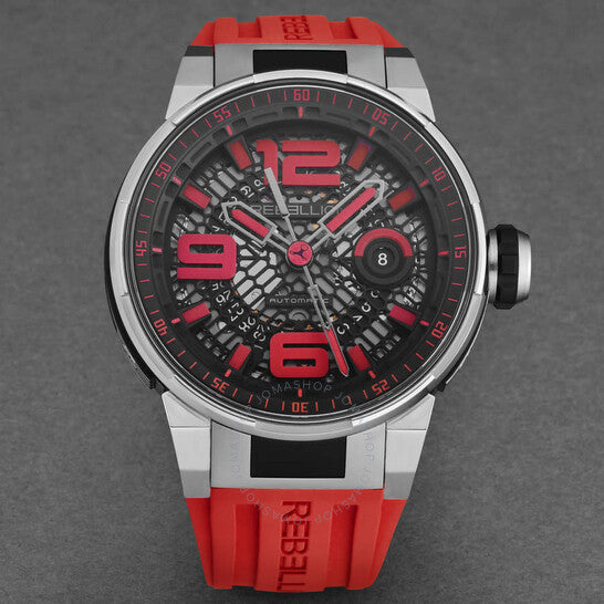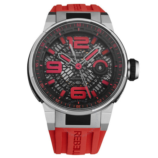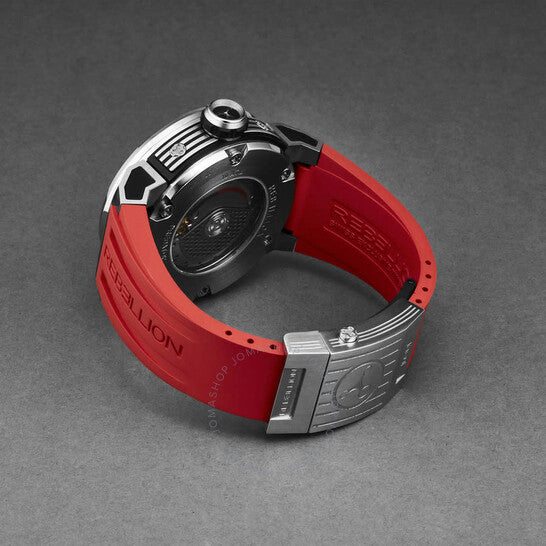 Silver-tone titanium case with a red rubber strap. Fixed silver-tone titanium bezel. Black dial with silver-tone hands and Arabic numeral & index hour markers. Minute markers around the outer rim. Dial Type: Analog. Luminescent hands and markers. Date display at the 3 o'clock position. Automatic movement. Scratch resistant sapphire crystal. Screw down crown. Transparent case back. Round case shape, case size: 48 mm, case thickness: 18 mm. Band width: 30 mm. Deployment with push button release clasp. Water resistant at 50 meters / 165 feet. Functions: date, hour, minute, second. Additional Info: 4 hz (28,800 vph). Predator 2.0 Series. Luxury watch style. Watch label: Swiss Made. Rebellion Predator 2.0 Automatic Black Dial Men's Watch RB.PR2.3H.TI.RD.