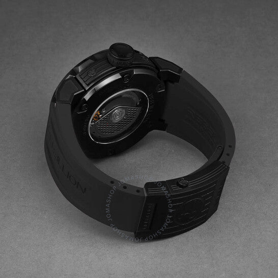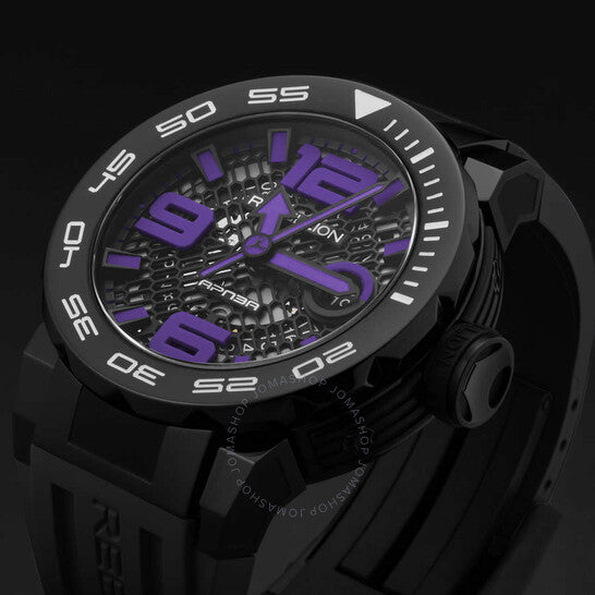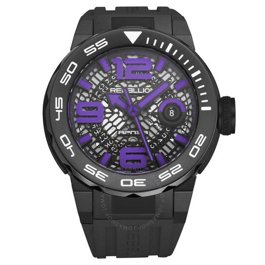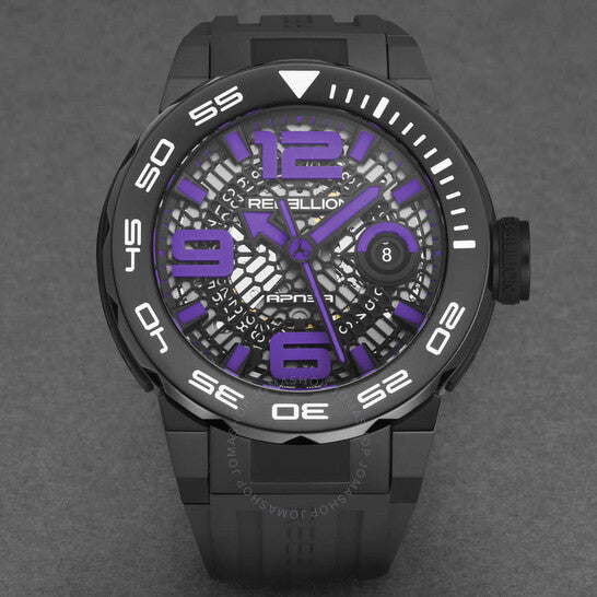 Black titanium case with a black rubber strap. Uni-directional rotating black titanium bezel. Black dial with black hands and Arabic numeral & index hour markers. Dial Type: Analog. Date display at the 3 o'clock position. Automatic movement. Scratch resistant sapphire crystal. Screw down crown. Transparent case back. Round case shape, case size: 48 mm, case thickness: 16.7 mm. Band width: 30 mm. Fold over clasp with a safety release. Water resistant at 100 meters / 330 feet. Functions: date, hour, minute, second. Additional Info: hour, minute, second, date. Predator Apnea Series. Luxury watch style. Rebellion Predator Apnea Automatic Black Dial Men's Watch RB.PAP.3H.TB.PU.