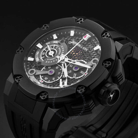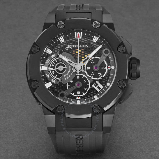 Black titanium case with a black rubber strap. Fixed black titanium bezel. Black dial with silver-tone hands and index hour markers. Minute markers around the outer rim. Dial Type: Analog. Luminescent hands and markers. Date display between 4 and 5 o'clock position. RE-1 automatic movement. Scratch resistant sapphire crystal. Screw down crown. Transparent case back. Round case shape, case size: 48 mm, case thickness: 16.3 mm. Band width: 30 mm. Fold over clasp with a safety release. Water resistant at 100 meters / 330 feet. Functions: chronograph, date, hour, minute, second. Additional Info: hours, minute, seconds, date, chronograph. Predator Series. Luxury watch style. Rebellion Predator Chronograph Automatic Black Dial Men's Watch RB.PR.CH.TB.BK.