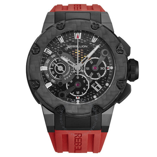 Black titanium case with a red rubber strap. Fixed black titanium bezel. Black dial with black hands and index hour markers. Minute markers around the outer rim. Dial Type: Analog. Luminescent hands and markers. Date display between 4 and 5 o'clock position. RE-1 automatic movement. Scratch resistant sapphire crystal. Screw down crown. Transparent case back. Round case shape, case size: 48 mm, case thickness: 16.3 mm. Band width: 30 mm. Deployment with push button release clasp. Water resistant at 100 meters / 330 feet. Functions: chronograph, date, hour, minute, second. Additional Info: automatic winding, developed by concepto. Predator Series. Luxury watch style. Rebellion Predator Chronograph Automatic Black Dial Men's Watch RB.PR.CH.TBCF.BK.
