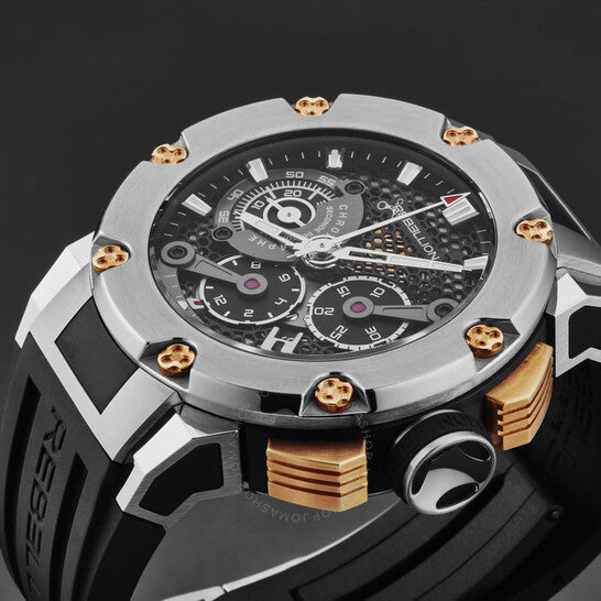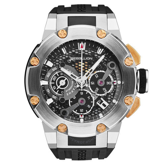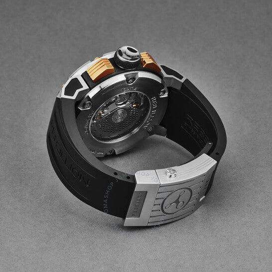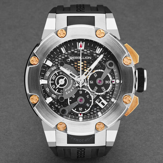 Grey titanium case with a black rubber strap. Fixed grey titanium bezel. Black dial with silver-tone hands and index hour markers. Minute markers around the outer rim. Dial Type: Analog. Luminescent hands and markers. Date display between 4 and 5 o'clock position. RE-1 Automatic winding, Developed by Concepto automatic movement. Scratch resistant sapphire crystal. Screw down crown. Transparent case back. Round case shape, case size: 48 mm, case thickness: 16.3 mm. Band width: 30 mm. Fold over clasp with a safety release. Water resistant at 100 meters / 330 feet. Functions: chronograph, date, hour, minute, second. Predator Series. Luxury watch style. Rebellion Predator Chronograph Automatic Black Dial Men's Watch RB.PR.CH.TI.5N.