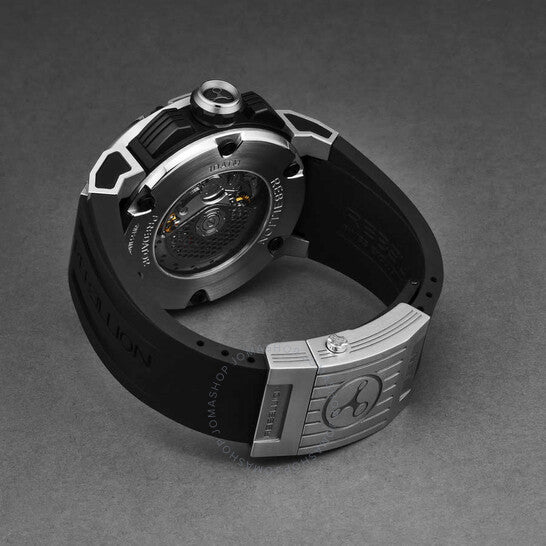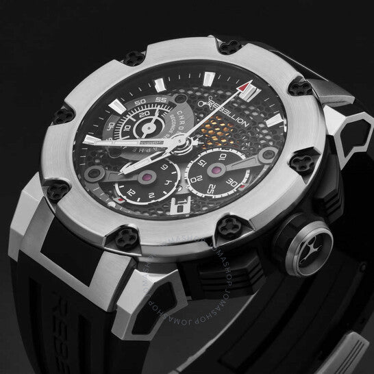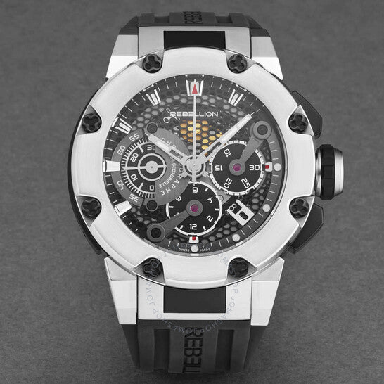 Grey titanium case with a black rubber strap. Fixed grey titanium bezel. Black dial with silver-tone hands and index hour markers. Minute markers around the outer rim. Dial Type: Analog. Luminescent hands and markers. Date display between 4 and 5 o'clock position. Chronograph - three sub-dials displaying: 60 second, 30 minute and 12 hour. RE-1 Developed by Concepto automatic movement. Scratch resistant sapphire crystal. Screw down crown. Transparent case back. Round case shape, case size: 48 mm, case thickness: 16.3 mm. Band width: 30 mm. Fold over clasp with a safety release. Water resistant at 100 meters / 330 feet. Functions: chronograph, date, hour, minute, second. Predator Series. Luxury watch style. Rebellion Predator Chronograph Automatic Black Dial Men's Watch RB.PR.CH.TI.BK-1.