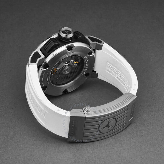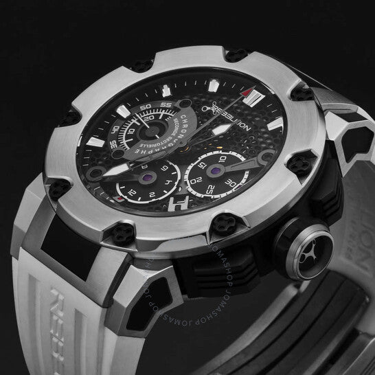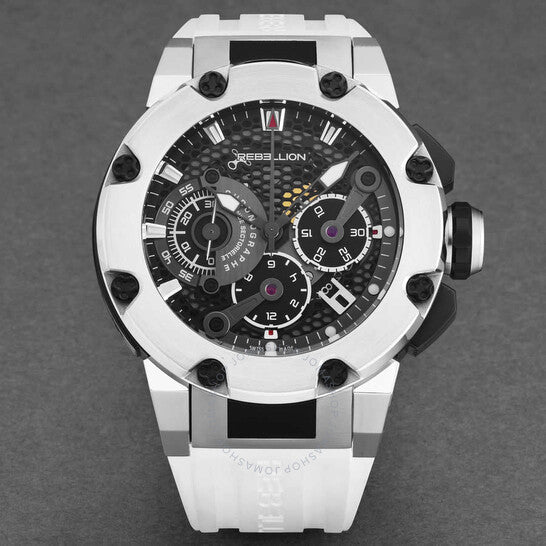 Grey titanium case with a white rubber strap. Fixed grey titanium bezel. Black dial with black hands and index hour markers. Minute markers around the outer rim. Dial Type: Analog. Luminescent hands and markers. Date display between 4 and 5 o'clock position. Chronograph - three sub-dials displaying: 60 second, 30 minute and 12 hour. RE-1 Developed by Concepto automatic movement. Scratch resistant sapphire crystal. Screw down crown. Transparent case back. Round case shape, case size: 48 mm, case thickness: 16.3 mm. Band width: 30 mm. Fold over clasp with a safety release. Water resistant at 100 meters / 330 feet. Functions: chronograph, date, hour, minute, second. Predator Series. Luxury watch style. Rebellion Predator Chronograph Automatic Black Dial Men's Watch RB.PR.CH.TI.BK-2.