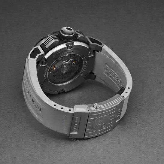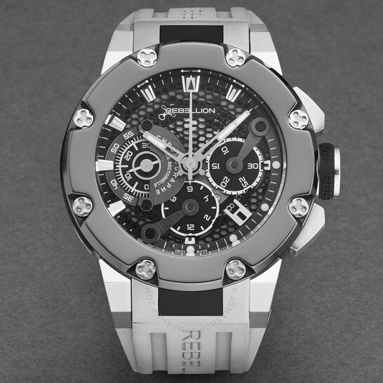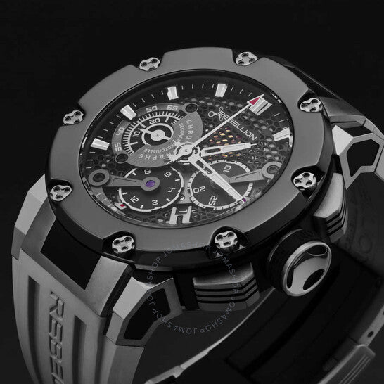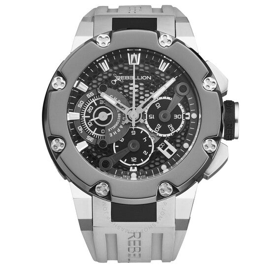 Grey titanium case with a grey rubber strap. Fixed black titanium bezel. Black dial with silver-tone hands and index hour markers. Minute markers around the outer rim. Dial Type: Analog. Luminescent hands and markers. Date display between 4 and 5 o'clock position. Chronograph - three sub-dials displaying: 60 second, 30 minute and 12 hour. RE-1 Developed by Concepto automatic movement. Scratch resistant sapphire crystal. Screw down crown. Transparent case back. Round case shape, case size: 48 mm, case thickness: 16.3 mm. Band width: 30 mm. Fold over clasp with a safety release. Water resistant at 100 meters / 330 feet. Functions: chronograph, date, hour, minute, second. Additional Info: hours, minute, seconds, date, chronograph. Predator Series. Luxury watch style. Rebellion Predator Chronograph Automatic Black Dial Men's Watch RB.PR.CH.TIBC.BK-1.