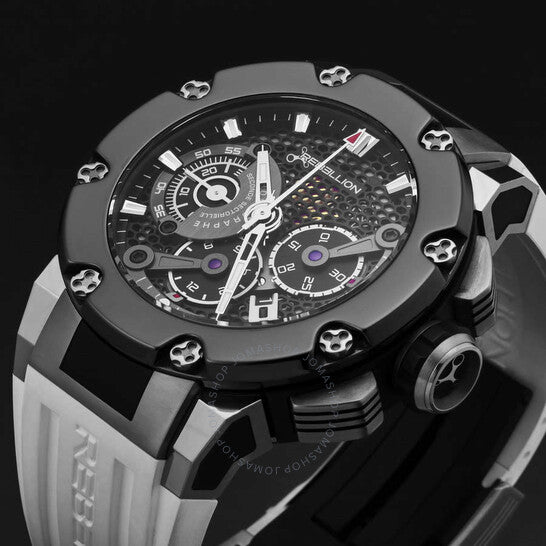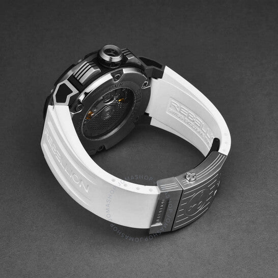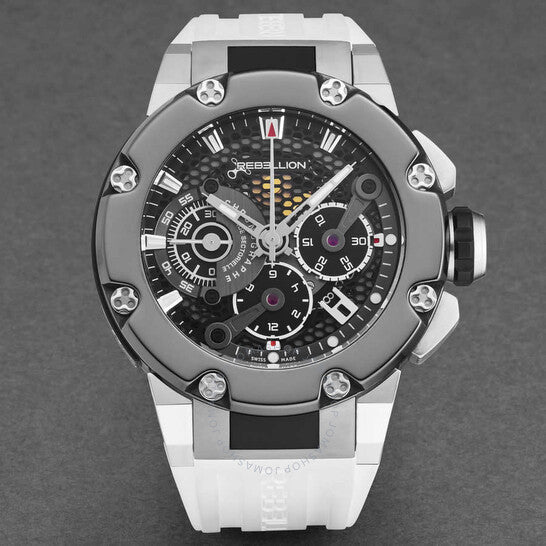 Grey titanium case with a white rubber strap. Fixed black titanium bezel. Black dial with silver-tone hands and index hour markers. Minute markers around the outer rim. Dial Type: Analog. Luminescent hands and markers. Date display between 4 and 5 o'clock position. Chronograph - three sub-dials displaying: 60 second, 30 minute and 12 hour. RE-1 Developed by Concepto automatic movement. Scratch resistant sapphire crystal. Screw down crown. Transparent case back. Round case shape, case size: 48 mm, case thickness: 16.3 mm. Band width: 30 mm. Fold over clasp with a safety release. Water resistant at 100 meters / 330 feet. Functions: chronograph, date, hour, minute, second. Predator Series. Luxury watch style. Rebellion Predator Chronograph Automatic Black Dial Men's Watch RB.PR.CH.TIBC.BK-2.