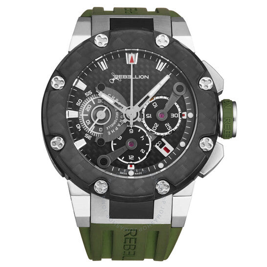 Grey titanium case with a green rubber strap. Fixed black carbon fiber bezel. Black dial with silver-tone hands and index hour markers. Minute markers around the outer rim. Dial Type: Analog. Luminescent hands and markers. Date display between 4 and 5 o'clock position. Chronograph - three sub-dials displaying: 60 second, 30 minute and 12 hour. RE-1 automatic movement. Scratch resistant sapphire crystal. Screw down crown. Transparent case back. Round case shape, case size: 48 mm, case thickness: 16.3 mm. Band width: 30 mm. Fold over clasp with a safety release. Water resistant at 100 meters / 330 feet. Functions: chronograph, date, hour, minute, second. Additional Info: hours, minute, seconds, date, chronograph. Predator Series. Luxury watch style. Rebellion Predator Chronograph Automatic Black Dial Men's Watch RB.PR.CH.TICF.BK.