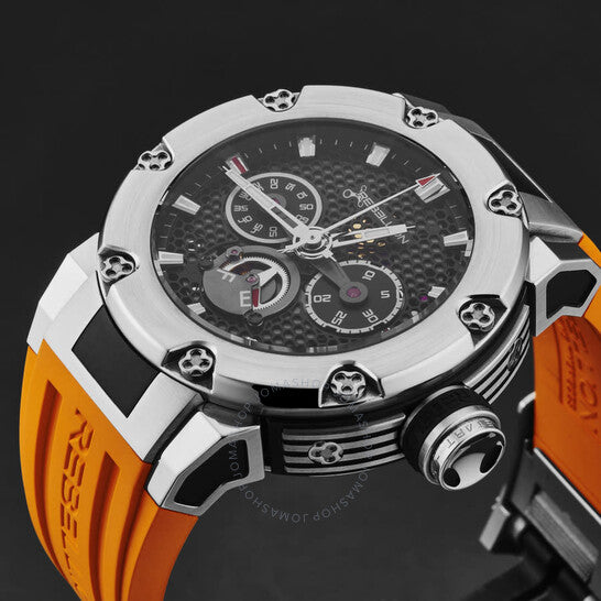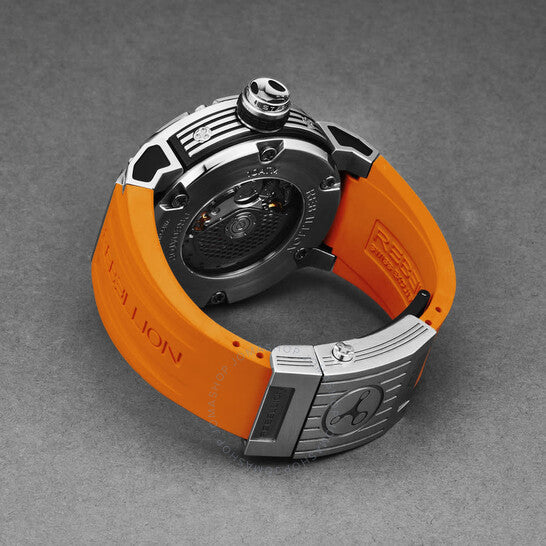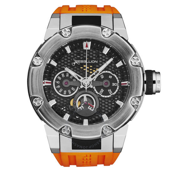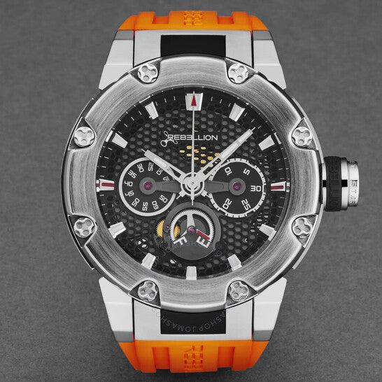 Silver-tone stainless steel case with a orange rubber strap. Fixed silver-tone stainless steel bezel. Black dial with silver-tone hands and index hour markers. Minute markers around the outer rim. Dial Type: Analog. Luminescent hands and markers. Frequency: 28800 Alt/H automatic movement. Scratch resistant sapphire crystal. Pull / push crown. Transparent case back. Round case shape, case size: 48 mm, case thickness: 16.2 mm. Band width: 29.5 mm. Fold over clasp with a safety release. Water resistant at 100 meters / 330 feet. Functions: chronograph, hour, minute, second. Predator Series. Luxury watch style. Rebellion Predator Chronograph Automatic Black Dial Men's Watch RB.PR.MCH.ST-2.