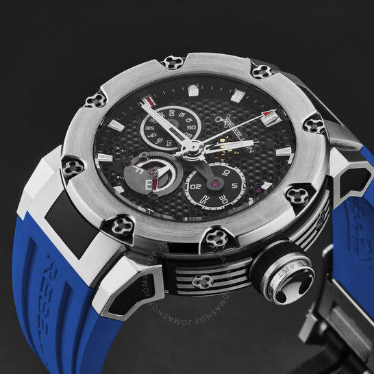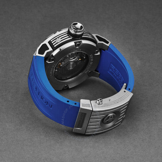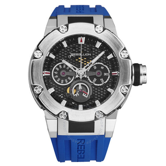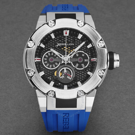 Silver-tone stainless steel case with a blue rubber strap. Fixed silver-tone stainless steel bezel. Black dial with silver-tone hands and index hour markers. Minute markers around the outer rim. Dial Type: Analog. Luminescent hands and markers. Frequency: 28800 Alt/H automatic movement. Scratch resistant sapphire crystal. Pull / push crown. Transparent case back. Round case shape, case size: 48 mm, case thickness: 16.2 mm. Band width: 29.5 mm. Deployment with push button release clasp. Water resistant at 100 meters / 330 feet. Functions: chronograph, hour, minute, second. Predator Series. Luxury watch style. Rebellion Predator Chronograph Automatic Black Dial Men's Watch RB.PR.MCH.ST-3.
