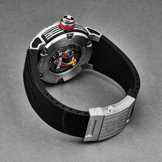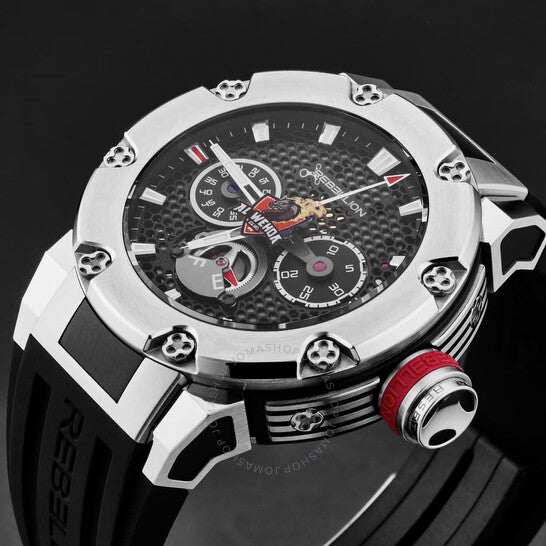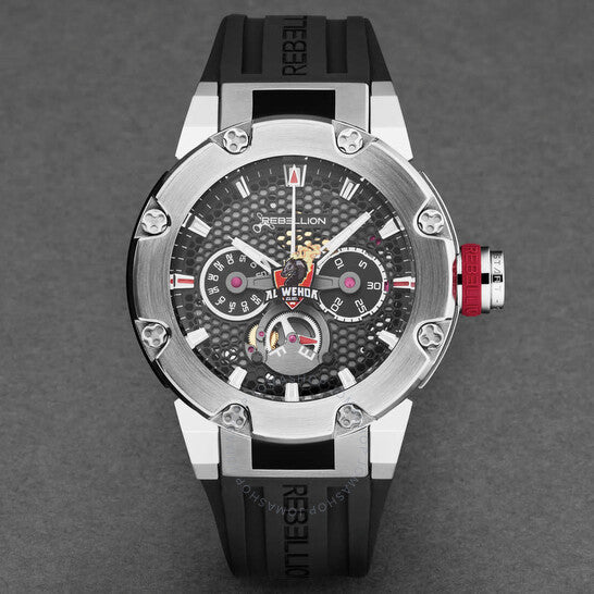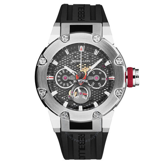 Silver-tone stainless steel case with a black rubber strap. Fixed silver-tone stainless steel bezel. Black dial with silver-tone hands and index hour markers. Dial Type: Analog. Luminescent hands and markers. Frequency: 28800 Alt/H automatic movement. Scratch resistant sapphire crystal. Pull / push crown. Transparent case back. Round case shape, case size: 48 mm, case thickness: 16.2 mm. Band width: 29.5 mm. Deployment with push button release clasp. Water resistant at 100 meters / 330 feet. Functions: chronograph, hour, minute, second. Additional Info: al wehda club. Predator Series. Luxury watch style. Rebellion Predator Chronograph Automatic Black Dial Men's Watch RB.PR.MCH.ST.ALW.