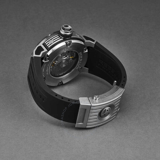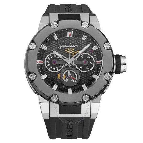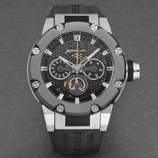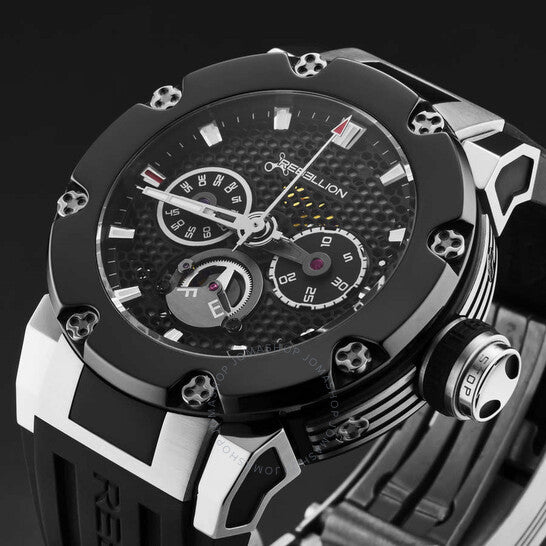 Silver-tone stainless steel case with a black rubber strap. Fixed black stainless steel bezel. Black dial with silver-tone hands and index hour markers. Minute markers around the outer rim. Dial Type: Analog. Luminescent hands and markers. Automatic movement. Scratch resistant sapphire crystal. Pull / push crown. Transparent case back. Round case shape, case size: 48 mm, case thickness: 16.2 mm. Band width: 29.5 mm. Deployment with push button release clasp. Water resistant at 100 meters / 330 feet. Functions: hours, minute, seconds, monopusher chronograph, power reserve. Additional Info: frequency: 28800 alt/h. Predator Series. Luxury watch style. Rebellion Predator Chronograph Automatic Black Dial Men's Watch RB.PR.MCH.STBC.