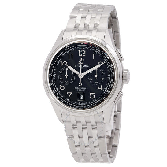 Silver-tone stainless steel case with a black stainless steel bracelet. Fixed silver-tone stainless steel bezel. Black dial with silver-tone hands and index-Arabic numeral hour markers. Minute markers around the outer rim. Dial Type: Analog. Luminescent hands. Date display at the 6 o'clock position. Chronograph - two sub-dials displaying: 60 second and 30 minute. Breitling Calibre B01 automatic movement with a 70 power reserve. Scratch resistant sapphire crystal. Pull / push crown. Transparent see through case back. Round case shape, case size: 42 mm. Fold over clasp with a safety release. Water resistant at 100 meters / 330 feet. Functions: chronograph, date, hour, minute, second,tachymeter. Sport watch style. Watch label: Swiss Made. Breitling Chronograph Automatic Black Dial Unisex Watch AB0145221B1A1.