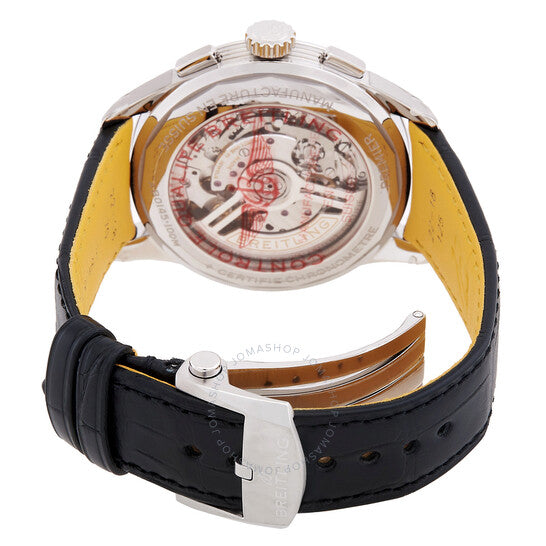 Silver-tone stainless steel case with a black alligator leather strap. Fixed silver-tone stainless steel bezel. Black dial with luminous hands and index-Arabic numeral hour markers. Minute markers around the outer rim. Dial Type: Analog. Luminescent hands and markers. Date display at the 6 o'clock position. Chronograph - two sub-dials displaying: 60 second and 30 minute. Breitling Calibre 01 Automatic movement, containing 47 Jewels, composed of 346 parts, bitting at 28800 vph, and has a power reserve of approximately 70 hours. Scratch resistant sapphire crystal. Pull / push crown. Transparent see through case back. Round case shape, case size: 42 mm, case thickness: 13.6 mm. Folding clasp. Water resistant at 100 meters / 330 feet. Functions: chronograph, hour, minute, second. Premier Series. Sport watch style. Watch label: Swiss Made. Breitling Premier Chronograph Automatic Black Dial Men's Watch AB0145221B1P2.
